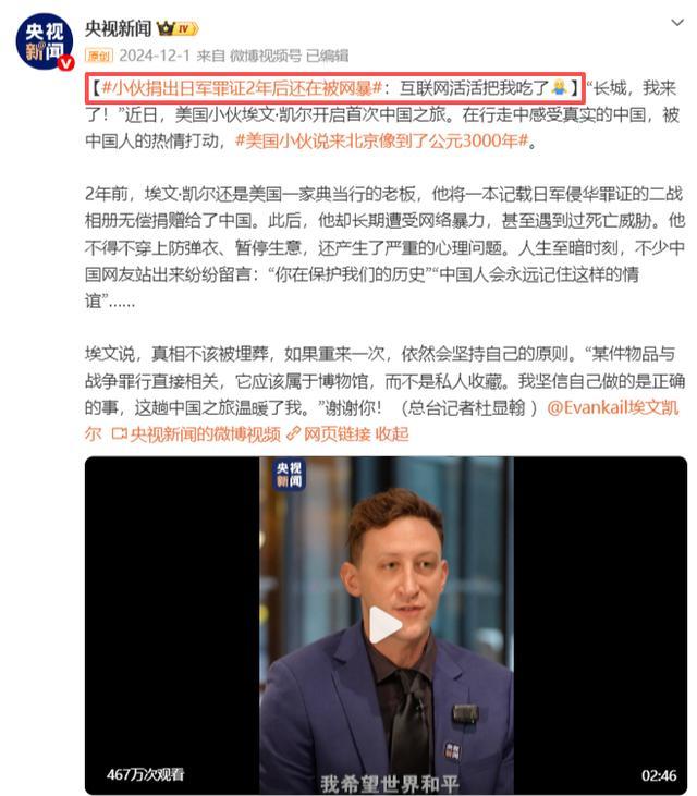 3年前,好意思国小伙埃文凯尔无偿捐赠侵华日军罪证相册。