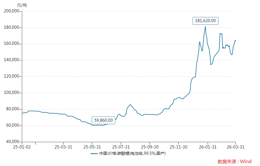 阐发Wind统计,本年一季度国内电板级碳酸锂均价达到15.44万元/吨,环比、同比均出现赫然高潮,较2025年同时的7.58万元/吨的均价更是涨幅翻倍。