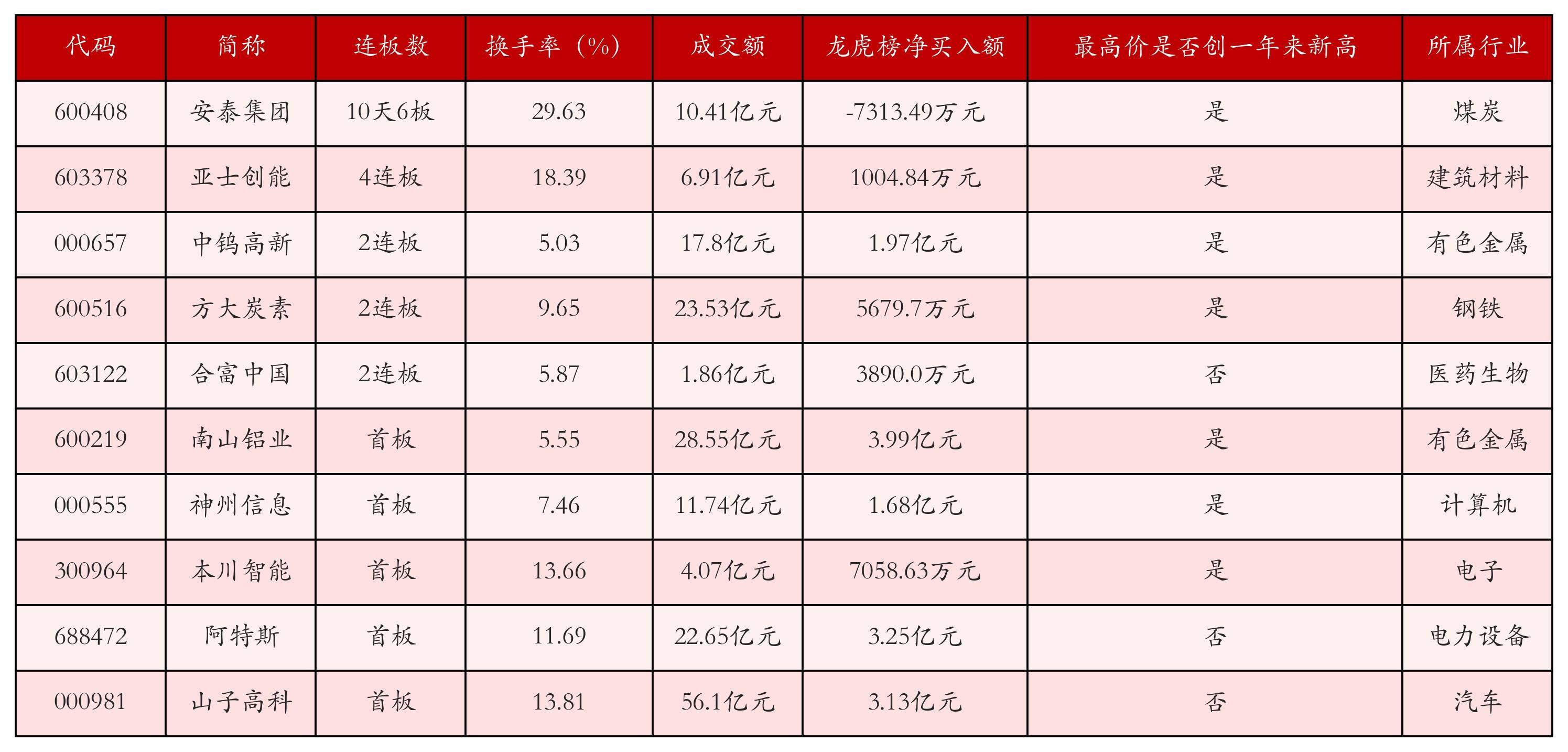 截止10月29日收盘,上证综指上升0.7%,收于4016.33点,深证成指上升1.95%,收于13691.38点,创业板指上升2.93%,收于3324.27点。本日沪深两市A股悉数62只涨停,详尽刻下连板数以及当日龙虎榜数据,其中较为强势的前三只个股分裂为:安泰集团(600408)、亚士创能(603378)与中钨高新(000657)。本日强势个股前10位具体数据见下表: