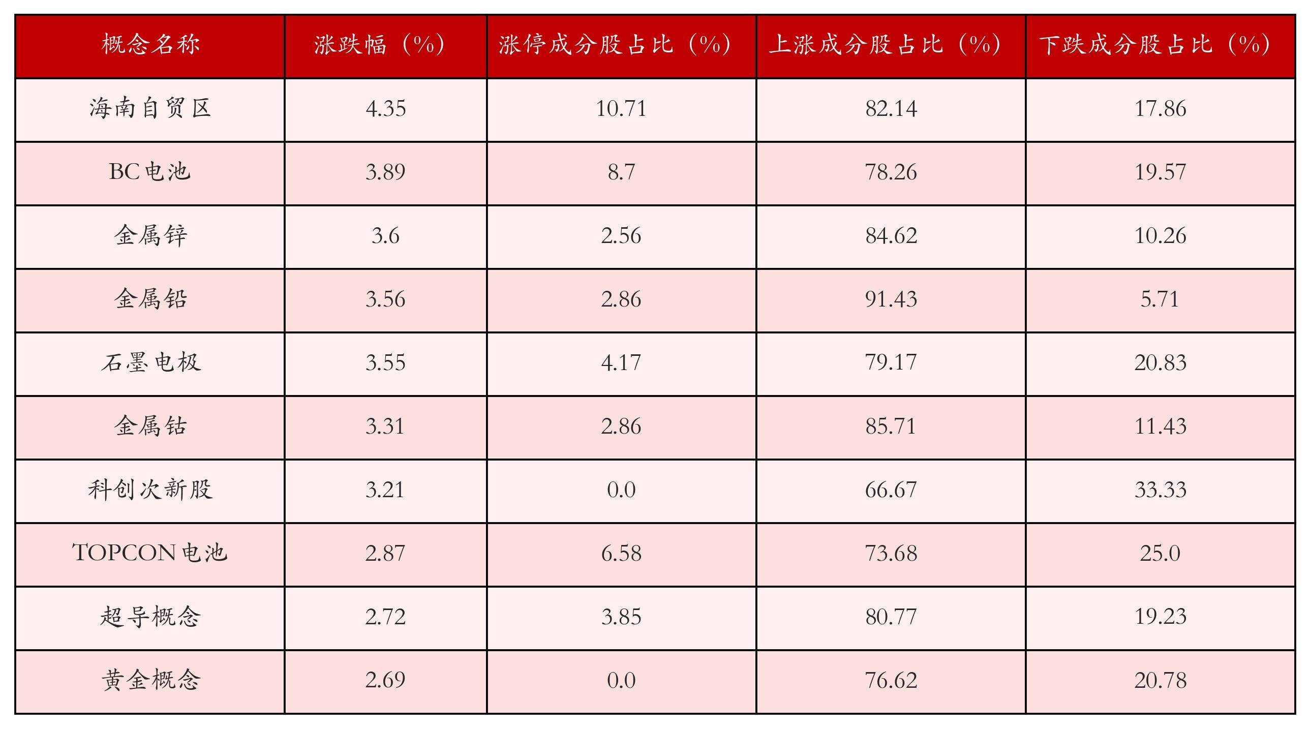 字据A股见识涨跌幅与所对应的股票池详尽分析,涨幅靠前的三个见识板块分裂为:海南自贸区、BC电板与金属锌。名次前10位的见识板块沟通数据见下表: