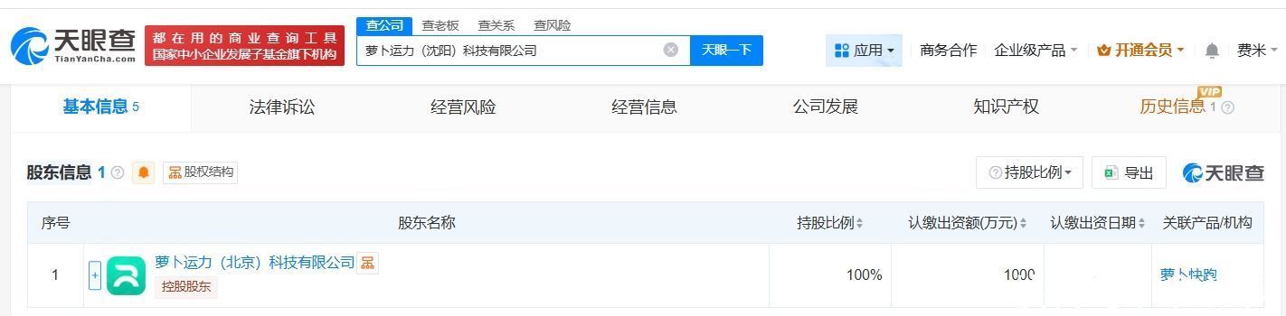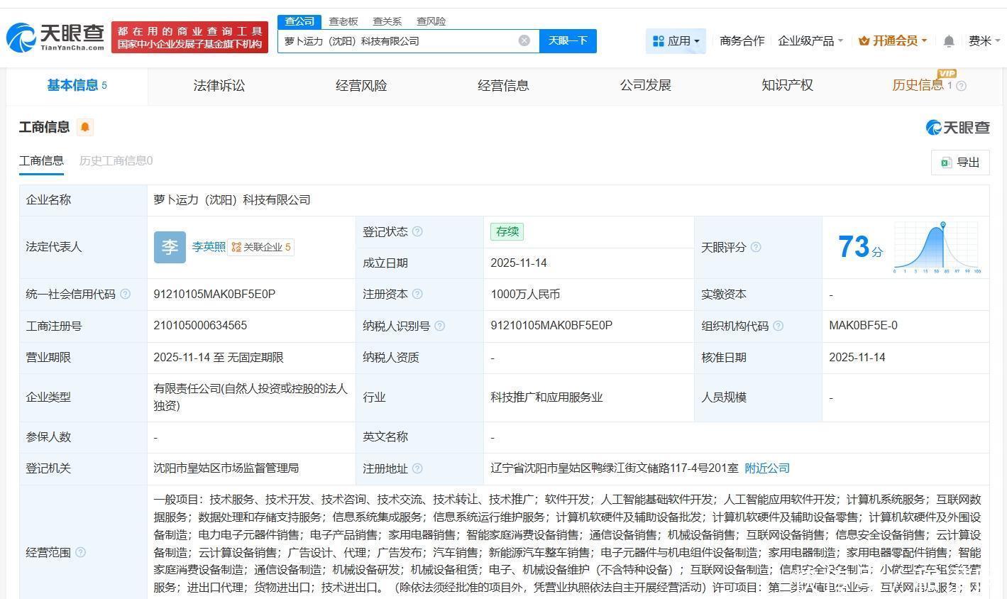 天眼查工商信息知道足彩看盘APP推荐,近日,萝卜运力(沈阳)科技有限公司栽植,法定代表东说念主为李英照,注册本钱1000万东说念主民币,贪图规模包括东说念主工智能基础软件诱惑、东说念主工智能欺诈软件诱惑、推测机系统就业等。鼓吹信息知道,该公司由萝卜快跑相关公司萝卜运力(北京)科技有限公司全资执股。